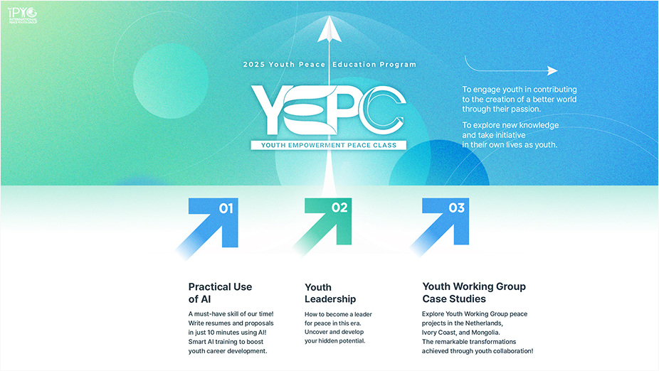 YEPC (Youth Empowerment Peace Class) is IPYGโ€™s global youth peace educational program designed to ensure that young adults are not excluded from their right to peace, and to help them move beyond simply โ€œknowingโ€ peace to “practicing” it in their everyday lives.