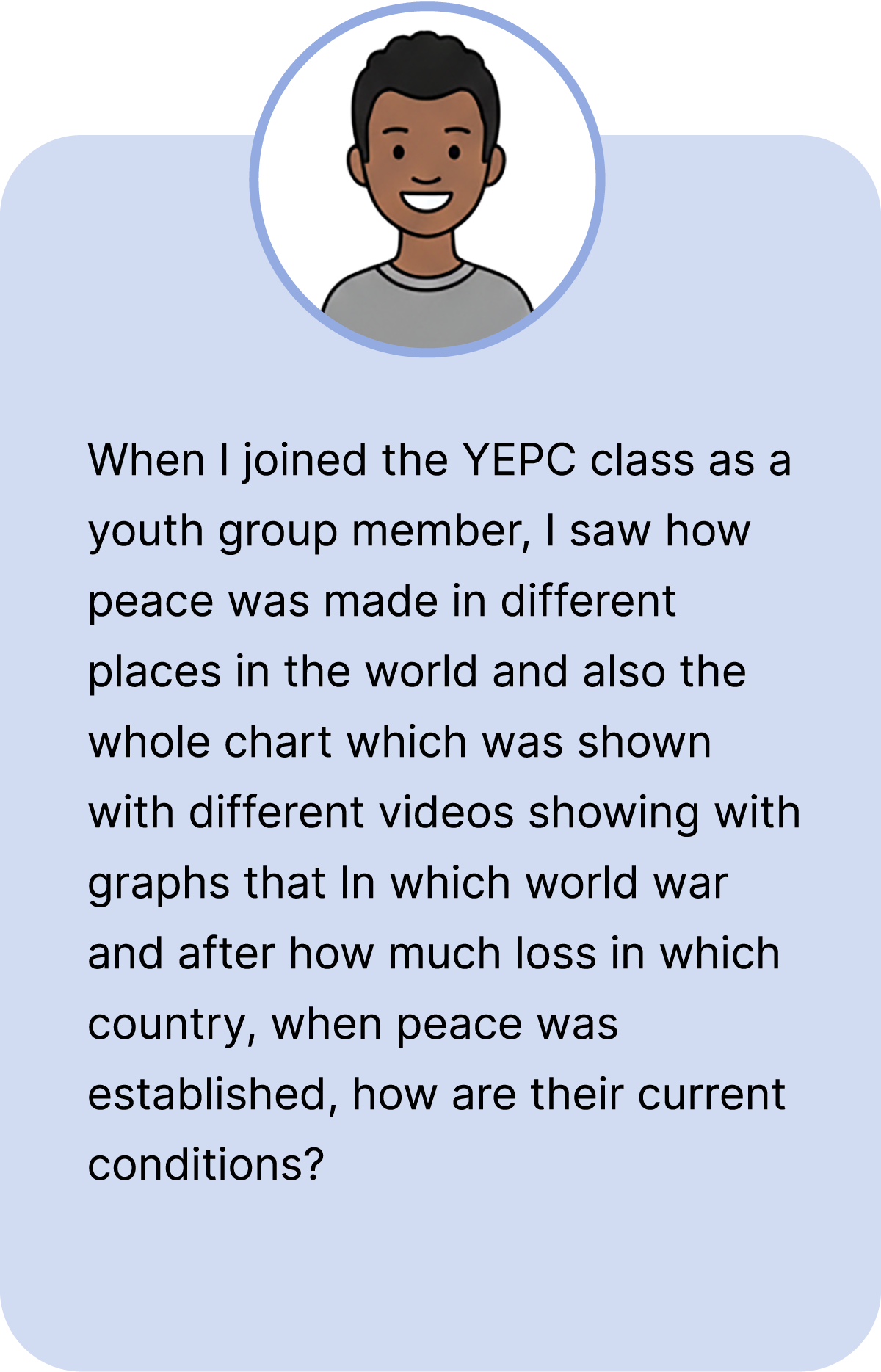 Each year, YEPC develops its curriculum by incorporating topics of interest to young people and timely issues related to peace.