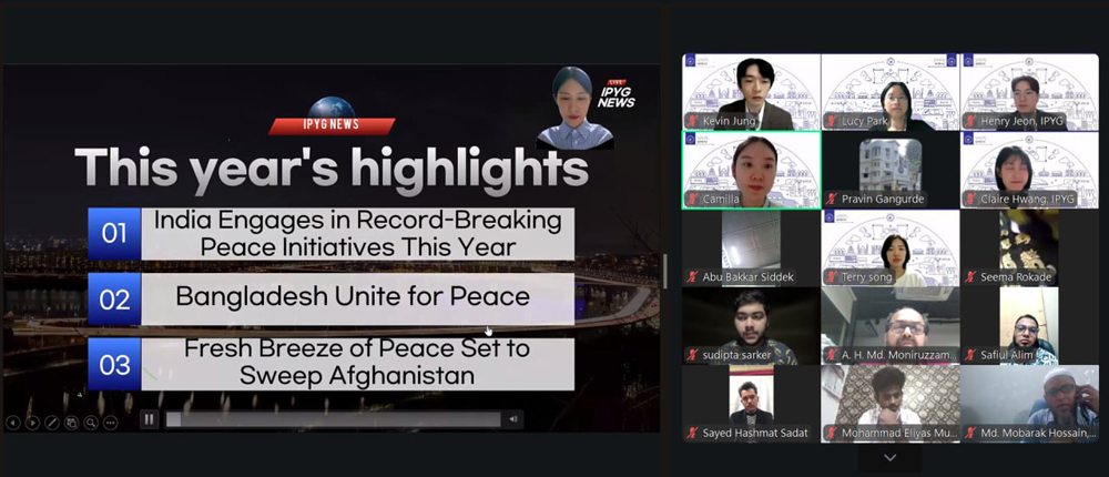 행사 참석자들은 주요 인사들의 메시지와 청년 평화구축 워킹그룹(YEPW) 멤버들의 활동 소감을 담은 영상을 시청했으며, 올해 각 국가에서 진행된 레지슬레이트피스(LP) 프로그램인 ‘에코 텐미닛’ 활동과 한국에서 열린 ‘HWPL 9·18 평화 만국회의 제11주년 기념식’ 영상도 시청했습니다. IPYG는 그동안의 경험을 바탕으로 조화와 평화 문화를 확산하기 위해 평화활동을 멈추지 말아야 한다는 메시지를 전했습니다.