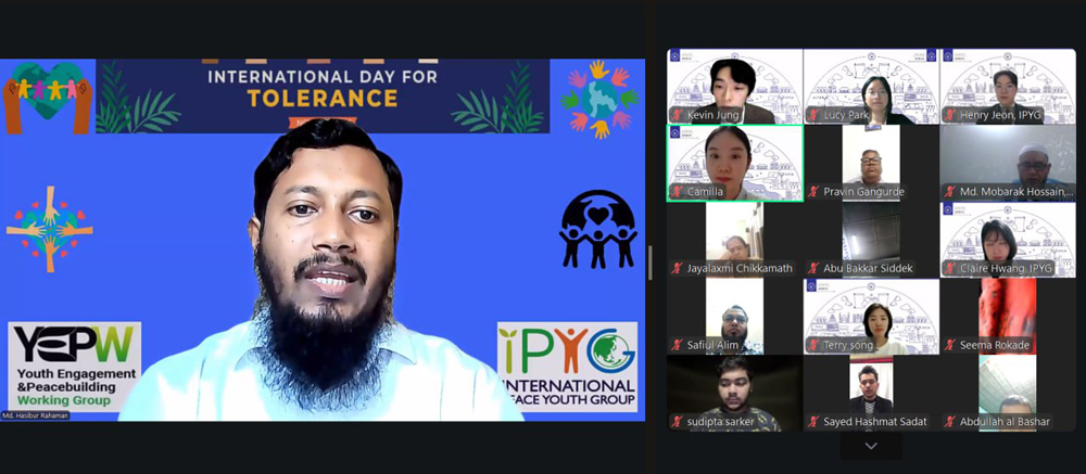 지난해 11월 15일, 유엔이 선포한 국제 관용의 날을 맞이하여 ‘국제 관용의 날 기념 온라인 행사’가 진행되었습니다. 이날 행사에 인도, 방글라데시, 아프가니스탄, 몰디브 4개국의 IPYG 파트너십 단체장과 HWPL 평화교육을 이수중인 교사들을 포함해 총 65명이 참석했습니다.