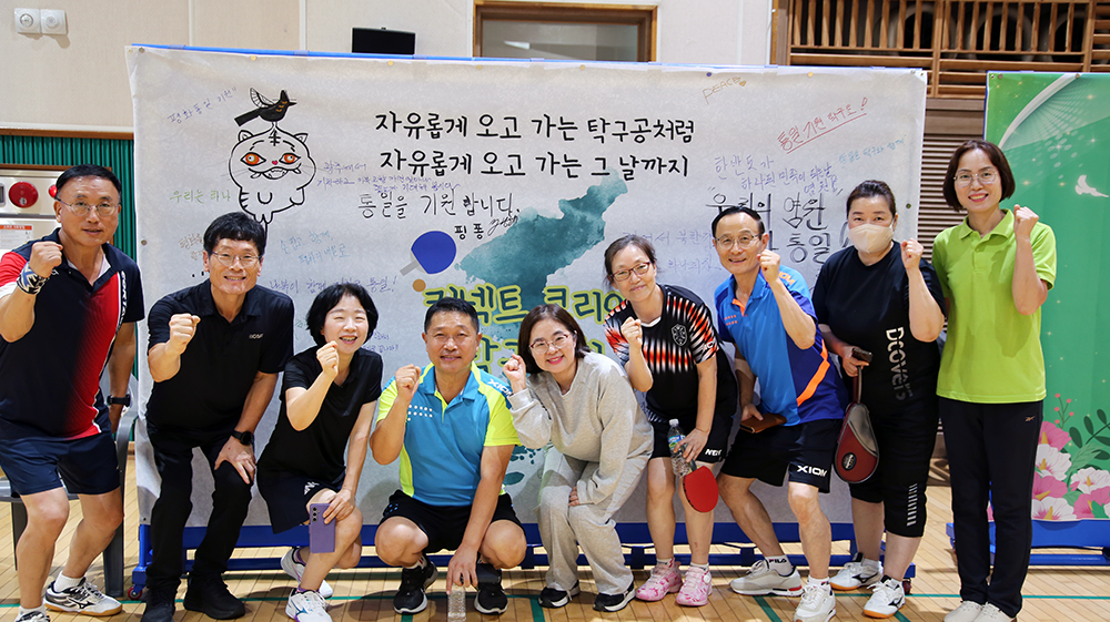 이번 대회는 실력 위주의 승부를 넘어, 서로 다른 배경을 가진 사람들이 한 공간에서 자연스럽게 어울리며 소통하는 장이었습니다. 참가자들은 팀을 이뤄 경기에 나섰고, 랠리가 이어질수록 긴장보다는 웃음이 번졌으며, 관람석에서도 응원의 목소리가 하나둘 더해졌습니다. 그렇게 탁구대라는 작은 공간 안에서 세대와 지역, 이념의 차이를 잠시 내려놓고 한 방향을 바라보는 시간이 이어졌습니다.