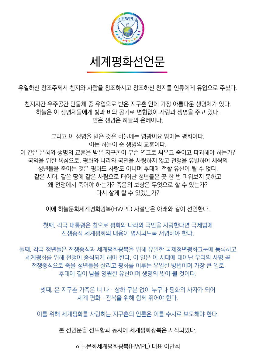 각국 청년들은 전쟁종식과 세계평화·광복을 위해 유일한 국제청년평화그룹에 등록하고 세계평화를 위해 전쟁이 종식되게 해야 한다. 이 일은 이 시대에 태어난 우리의 사명 곧 전쟁종식으로 죽을 청년들을 살리고 평화를 이루는 유일한 방법이며 가장 큰 일로 후대에 길이 남을 영원한 유산이며 생명의 빛이 될 것이다.